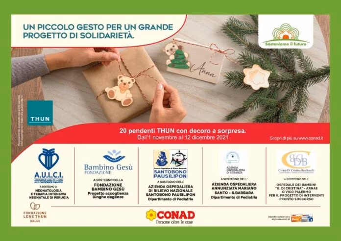 ROMA (ITALPRESS) – PAC 2000A Conad consapevole del ruolo che ricopre nelle comunità in cui opera tutti i giorni promuove “Un piccolo gesto per un grande progetto di solidarietà” in collaborazione con THUN. In tutti i punti vendita Conad aderenti delle regioni di Umbria, Lazio, Campania, Calabria e Sicilia a partire dal 1° novembre e fino al 12 dicembre, ogni 15 euro di spesa, offre ai propri clienti la possibilità di acquistare uno dei 20 soggetti natalizi THUN da collezionare per l’addobbo e la decorazione al prezzo di 1.50 euro. Per ogni acquisto, PAC 2000A Conad devolverà 50 centesimi a sostegno di progetti che riguardano i reparti pediatrici di cinque ospedali: l’Ospedale pediatrico Bambino Gesù di Roma, il Reparto di neonatologia e terapia intensiva neonatale di Perugia attraverso l’associazione AULCI, l’Azienda ospedaliera Santobono Pausilipon di Napoli, l’Azienda ospedaliera di Cosenza e l’Ospedale dei Bambini “G. Di Cristina” ARNAS Civico di Palermo.