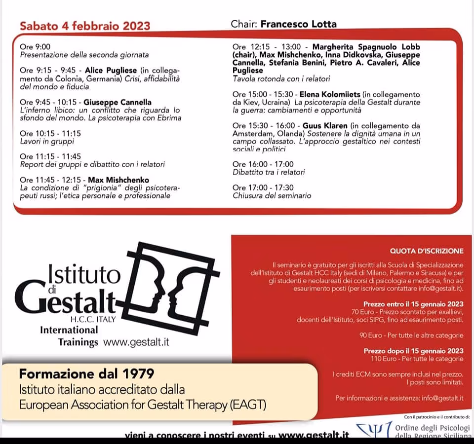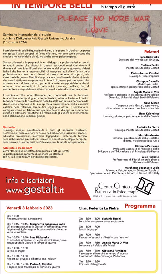 La funzione della psicoterapia in tempo di guerra: questo il titolo suggestivo del seminario internazionale di studi tenutosi a Palermo nei giorni 3 e 4 Febbraio 2023, presso lo Splendid Hotel La Torre, e organizzato dall’Istituto di Gestalt H.C.C. Italy, Scuola di Specializzazione in Psicoterapia, di Palermo.